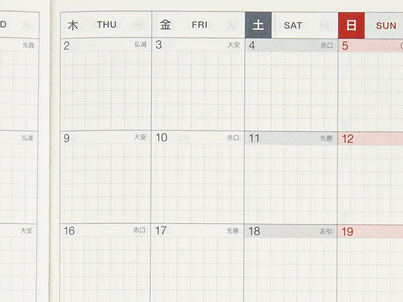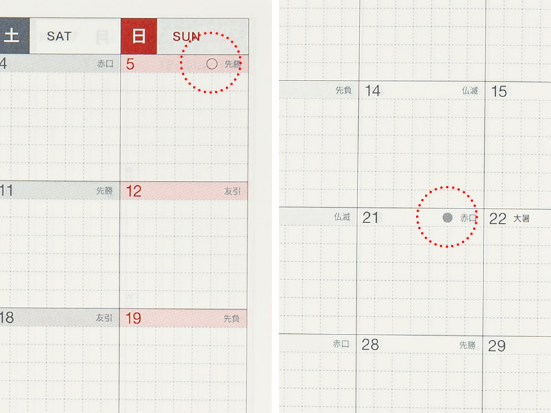 「大安」「仏滅」といった六曜を表記しています。大事な行事の日取りを決める際にお役立てください。