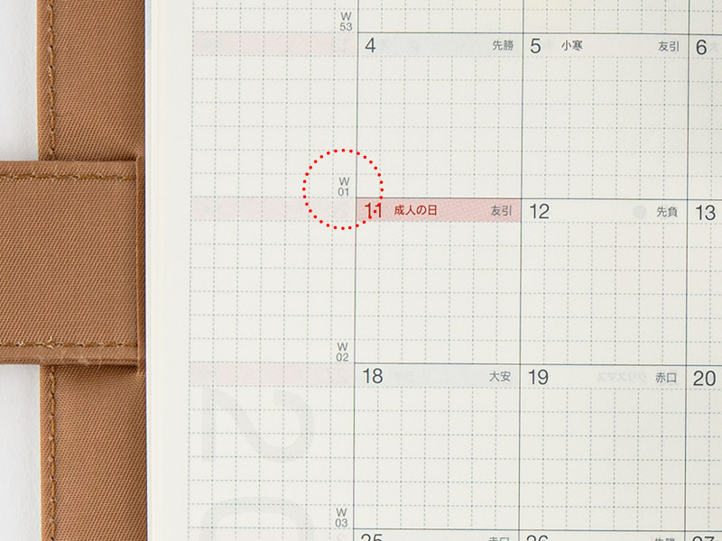 年始から数えて、その週が何週目であるかを表した「週番号」を載せています。※週番号の数え方は「1月の第1木曜日が含まれる週」を「W01」とする方式を採用しています。