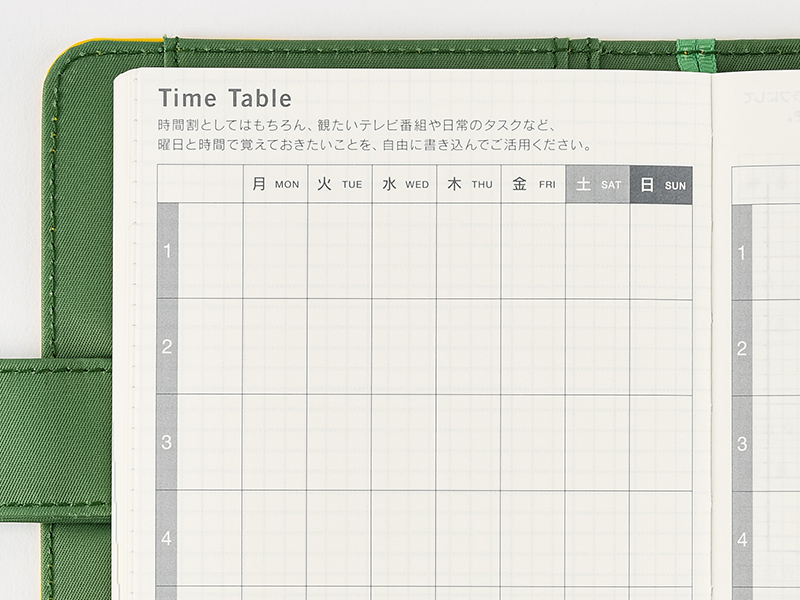 曜日ごとの決まった内容を書いておけるタイムテーブルを2つ収録。時間割、テレビ番組の放送時間、家事当番の分担など、テーマを決めて使うことができます。
