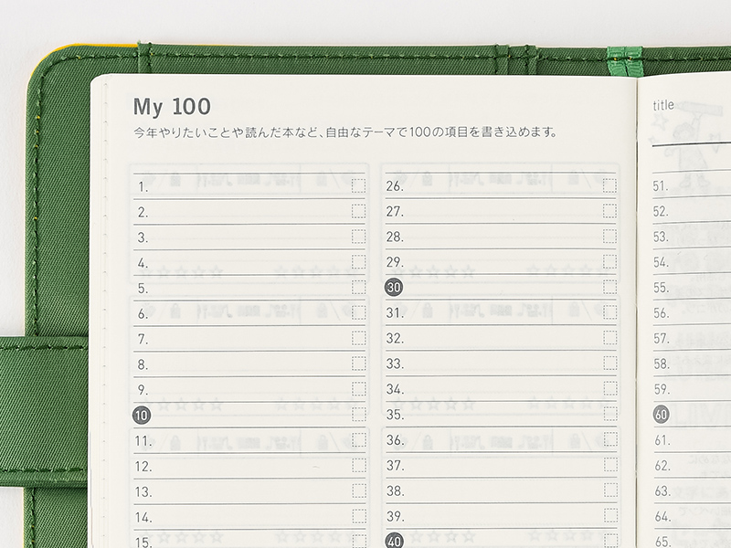 2018年版で非常に人気の高かったおまけページを復活させました。1年でやりたいことや読んだ本、見た映画など、自由なテーマで100の項目を書き込めます。