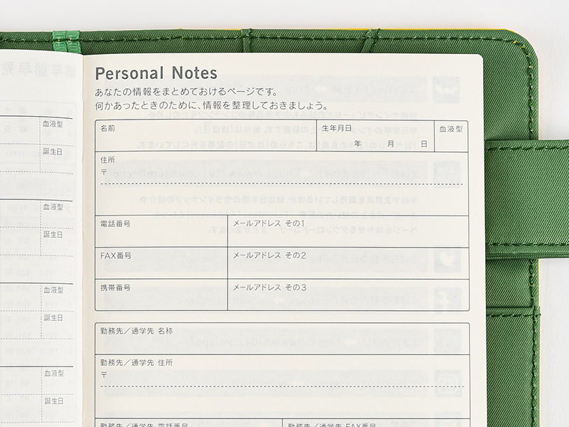 氏名、生年月日、住所、電話番号など自分の情報をまとめて書いておくページです。知られて困るような情報の取り扱いにはご注意を。