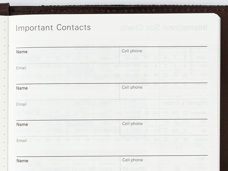 氏名、生年月日、住所、電話番号など自分の情報をまとめて書いておくページです。知られて困るような情報の取り扱いにはご注意を。