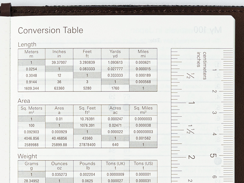 日本や海外でよく使われる単位の換算表です。また、おおよその長さを計れるインチとセンチの定規を印刷しています。
