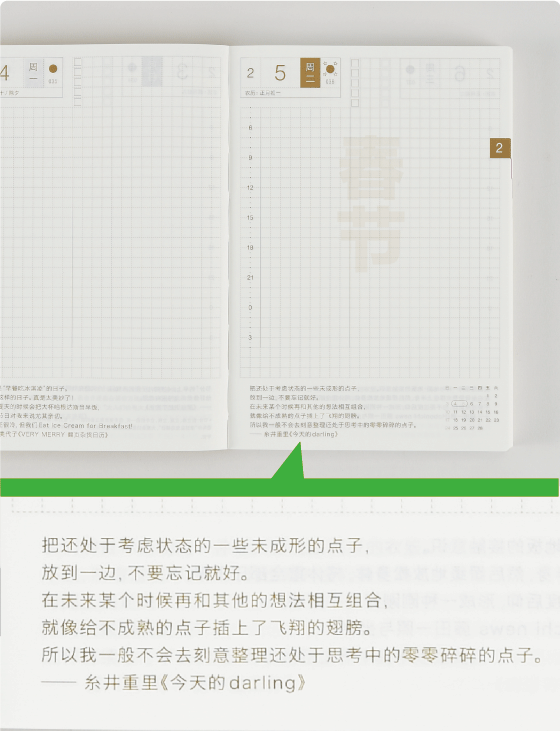 3年目、多くのかたからの「革の手帳がほしいです」という声を受けて、黒革・茶革・ヌメ革のカバーが登場。5色のナイロンカバーとあわせて8種類から選べるようになりました。カバー自体も引き続き進化し、「外側のポケット」が登場。ナイロンカバーに撥水加工をほどこしたのも、この年からでした。手帳の中身は1日ページに「秘密の縦ライン(使いたい人だけが使えるさりげない区切り線)」が登場。チェックボックスはイラストがなくなり、シンプルな見た目になりました。さらにこの年、それまで全ページに入っているわけではなかった「日々の言葉」が365日すべてに入るようになりました。「ほぼ日刊イトイ新聞」から生まれた手帳ならではの特徴として、以来毎年収録されています。