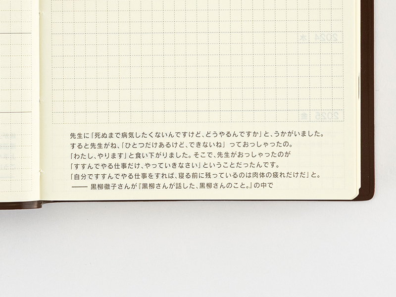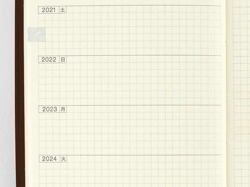 基本の見開きは、左が「5年分の日付ページ」、右が「方眼メモ」。毎日同じ内容を記録したい人にも、気分で書きかたを変えたい人にも使いやすい、自由度の高いレイアウトです。