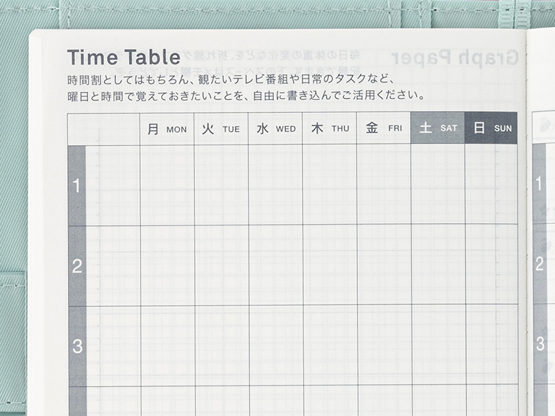 曜日ごとの決まった内容を書いておけるタイムテーブルを、オリジナルサイズは2つ、カズンサイズは2つ収録。時間割、テレビ番組の放送時間、家事当番の分担など、テーマを決めて使うことができます。