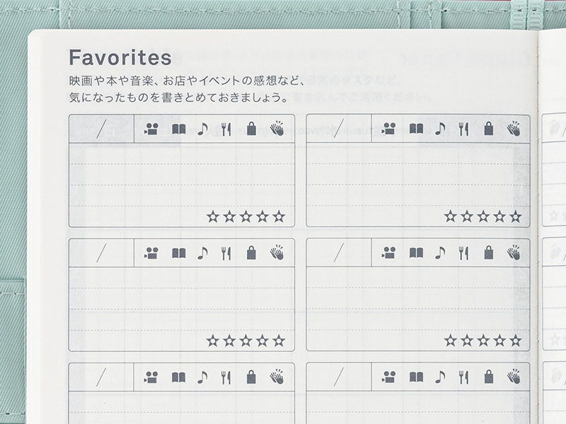 映画、本、音楽、レストラン、買ったものなど、お気に入りを書きとめておくページ。5段階の「☆」マークを使えば、自分だけのランキングもつくれます。オリジナルサイズは10個、カズンサイズは12個の好きなものを書くことができます。