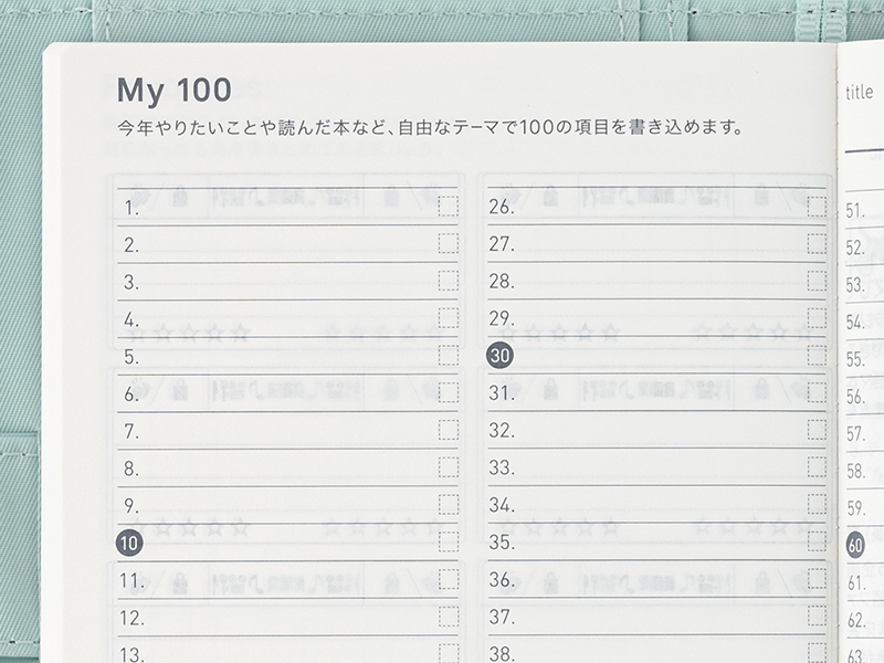 やりたいことや読んだ本、見た映画など、自由なテーマで100の項目を書き込むことができるページです。