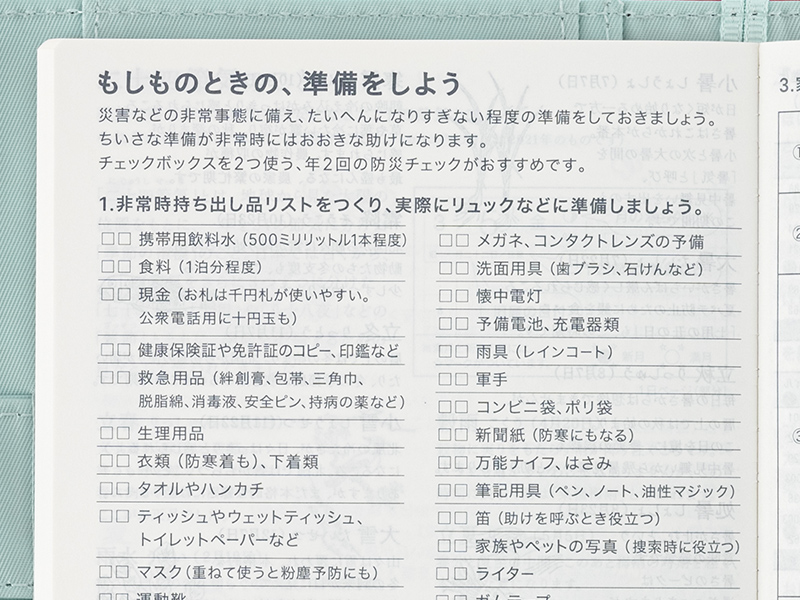 非常時の持ち出し品と、ふだんから備蓄しておきたいものをまとめました。避難場所や緊急連絡先など、家族や親しい人と話し合ったことを書いておけるスペースもあります。