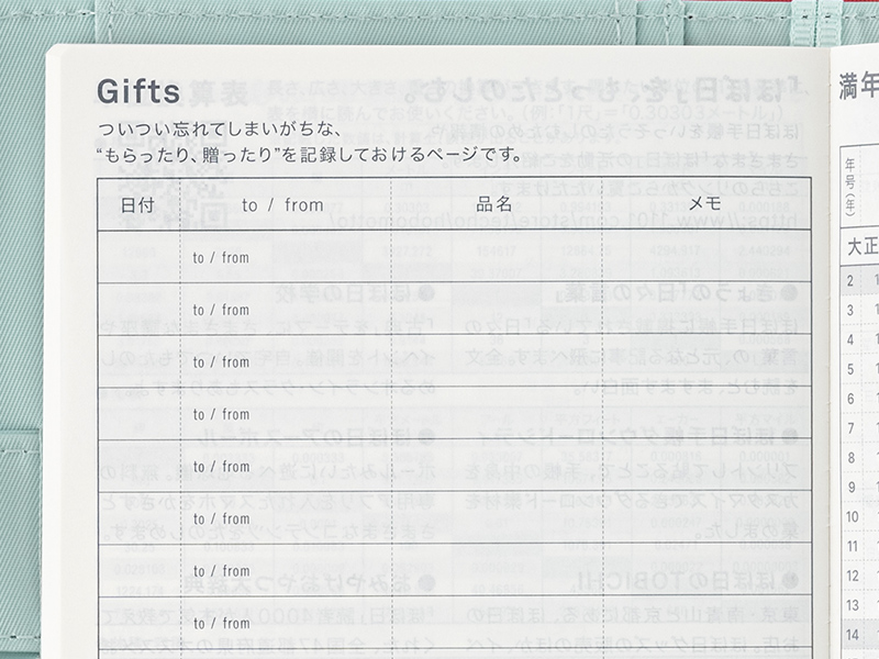 ついつい忘れてしまいがちな”もらったり、贈ったり”を記録しておけるページです。贈り先や贈り主、品名、日付などをオリジナルサイズは17件分、カズンサイズは20件分、書き込めます。