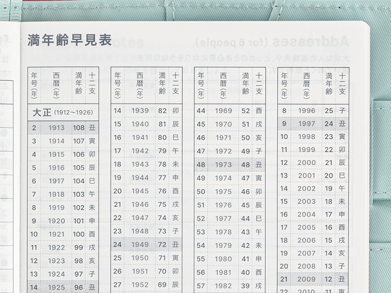 満年齢と十二支が、ひと目でわかる早見表。満年齢0歳から108歳まで掲載しています。2021年の干支である「丑」の行は背景に色を入れ、年男と年女がすぐわかるようにしました。