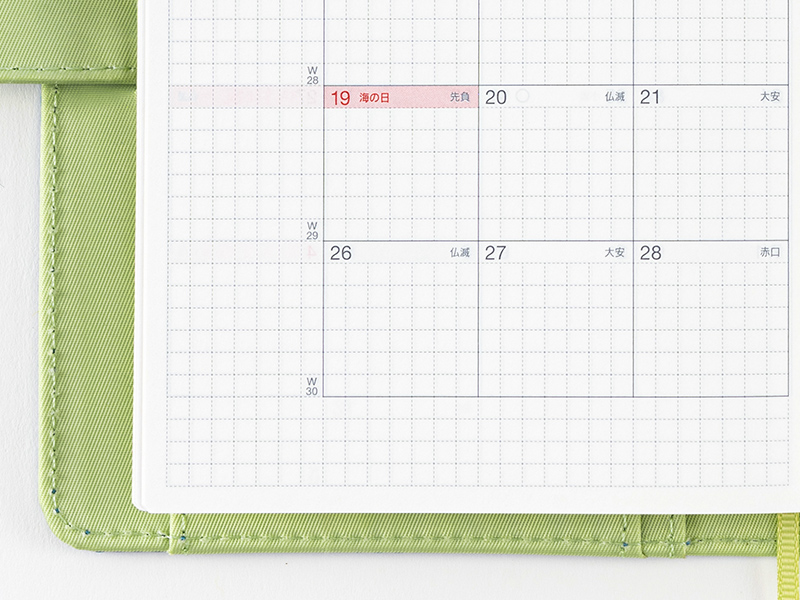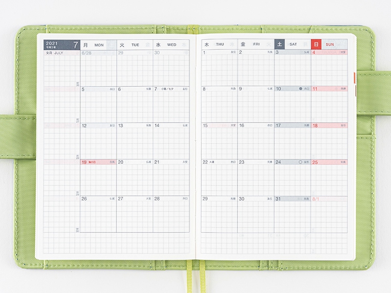 ページ全体に方眼がうすく印刷されていて、予定やメモを記入しやすくなっています。ブルーグレーとレッドの、書きこんだときにも視認性の高いデザインです。<「月間カレンダー」掲載期間>1月はじまり版:2020年12月~2022年3月4月はじまり版:2021年2月~2022年5月