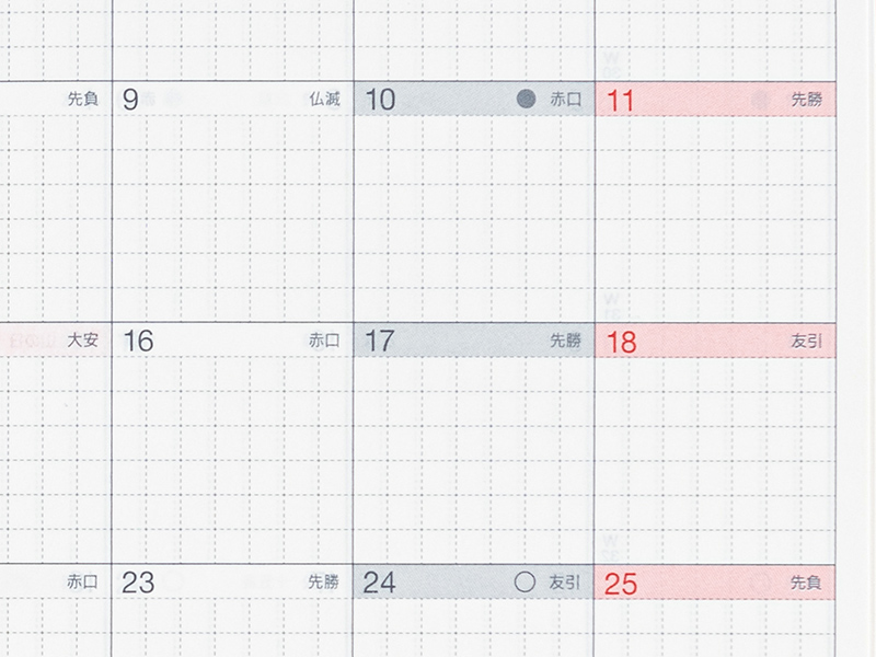 「大安」「仏滅」といった六曜を表記しています。大事な行事の日取りを決める際にお役立てください。