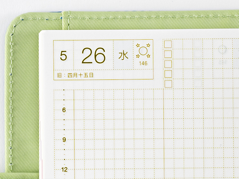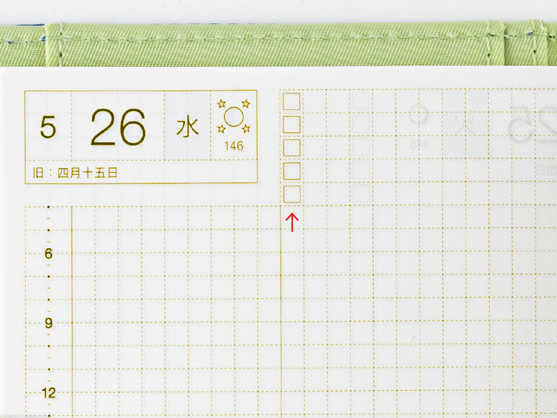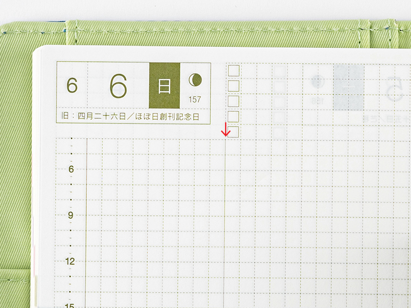 タイムテーブルに予定を書き込むスペースと、メモを書き込むスペースを区切るためのラインをうすく印刷しています。使用しないときにも邪魔にならないちょうどいい線の濃さがポイントです。