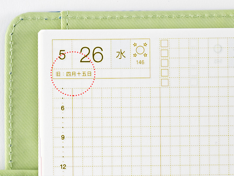 実際の日付の下に旧暦を掲載しています。旧暦に基づいた季節を表す区切りの日である「二十四節気」や「雑節」も掲載しています。