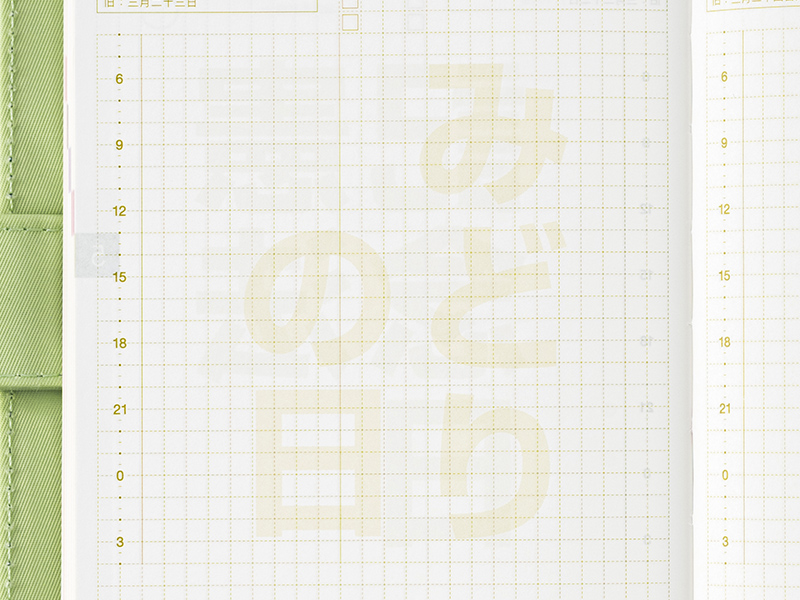手帳を使う人のさまざまな仕事や生活習慣に柔軟に対応できるよう、24時間の時間軸を採用。1時間刻みで「・」の記号が、30分刻みで「-」の記号が入っています。