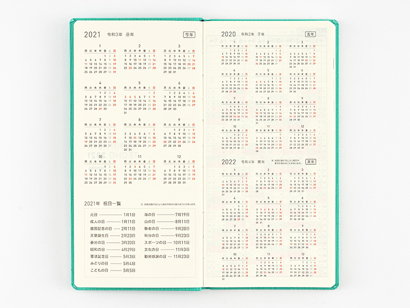 2020年、2021年、2022年の3年分のカレンダーを見開きで掲載しています。わかりやすいように「去年」「今年」「来年」の表記も入れています。