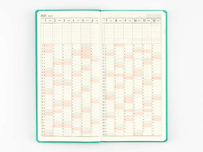 1年分を見開きで一覧できる、長期的な予定管理のページです。ページの上部に7ライン分の自由なスペースを設けました。<掲載期間>1月はじまり版:2021年1月~2021年12月4月はじまり版:2021年4月~2022年3月