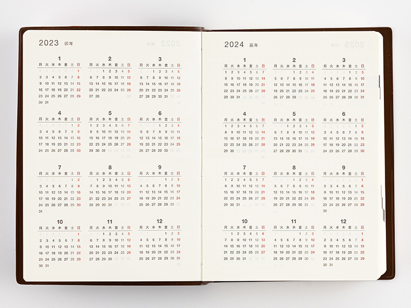 内表紙をめくると次のページからは、1年1ページで、5年分の年間カレンダーを掲載しています。西暦の横には干支を記載しています。