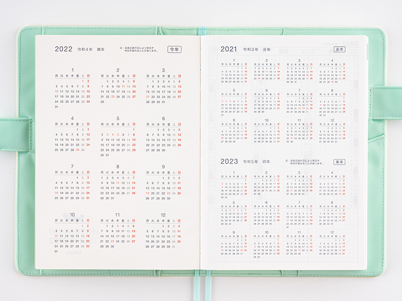 2021年、2022年、2023年の3年分のカレンダーを見開きで掲載しています。ぱっと見たときにわかりやすいように「去年」「今年」「来年」の表記入りです。