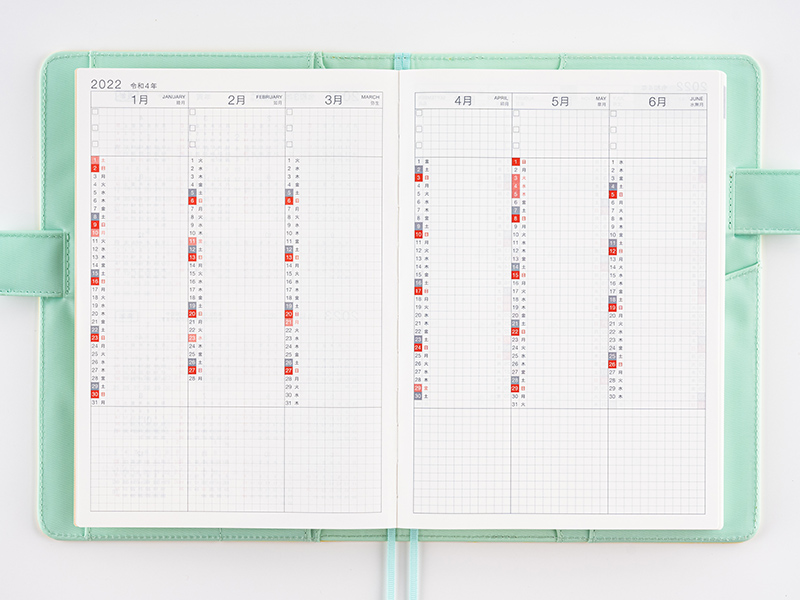 6ヵ月を見開きで一覧できる長期的な予定管理のページを12カ月分収録。ページの上部には、目標や、やるべきことを書いておけるチェックボックスが3つあります。下部には、自由に書き込めるスペースを設けています。<「年間インデックス」掲載期間>1月はじまり版:2022年1月~12月4月はじまり版:2022年4月~2023年3月