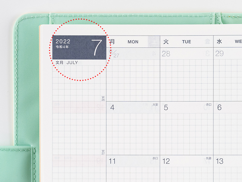 各月の見出し部分には、その月を示す「数字」と、「その年の西暦」「年号」「月の和名」「英語での月名」年始から数えて、その週が何週目であるかを表した「週番号」を表記しています。