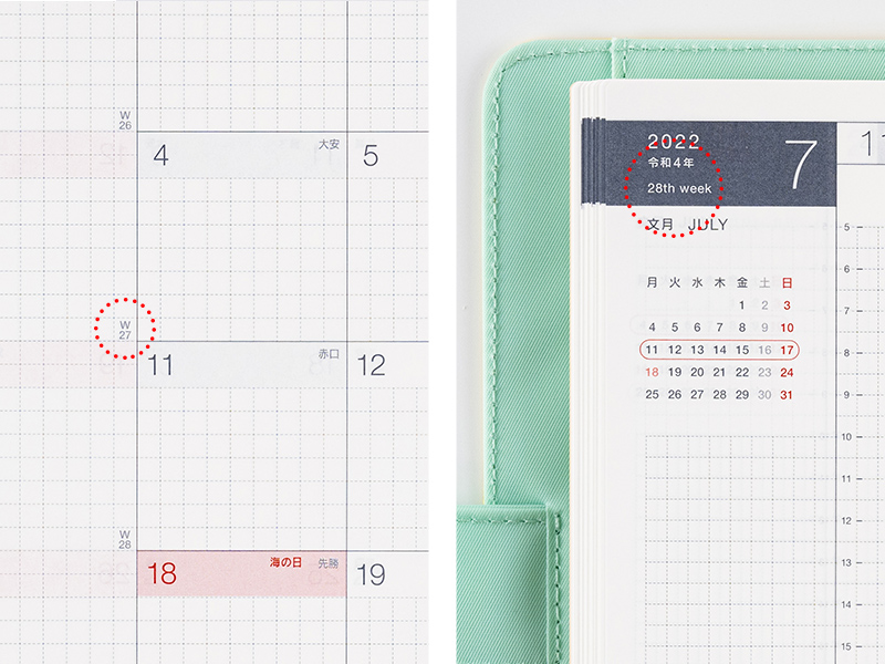 年始から数えて、その週が何週目であるかを表した「週番号」を載せています。※週番号の数え方は「1月の第1木曜日が含まれる週」を「W01」とする方式を採用しています。