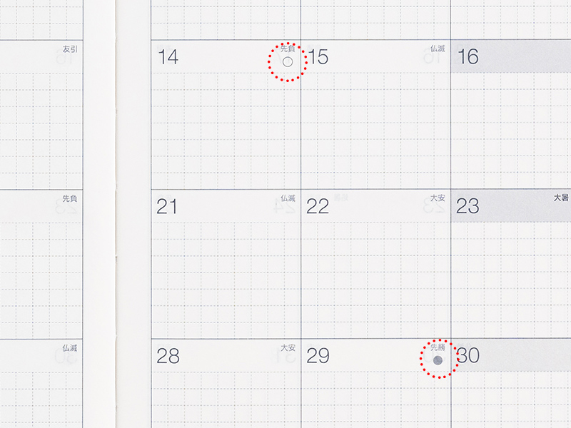 「大安」「仏滅」といった六曜を表記しています。大事な行事の日取りを決める際にお役立てください。