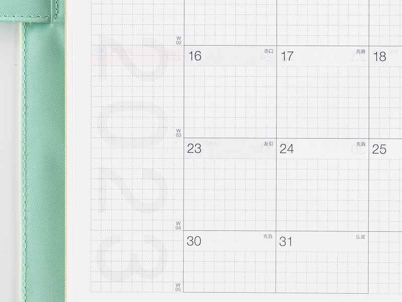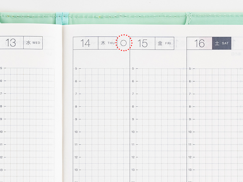 1日ごとに予定などを自由に書きこむことができます。方眼がうすく印刷されているため小さな文字も書きやすく、ボックス内を区切って使いたいときにも便利です。