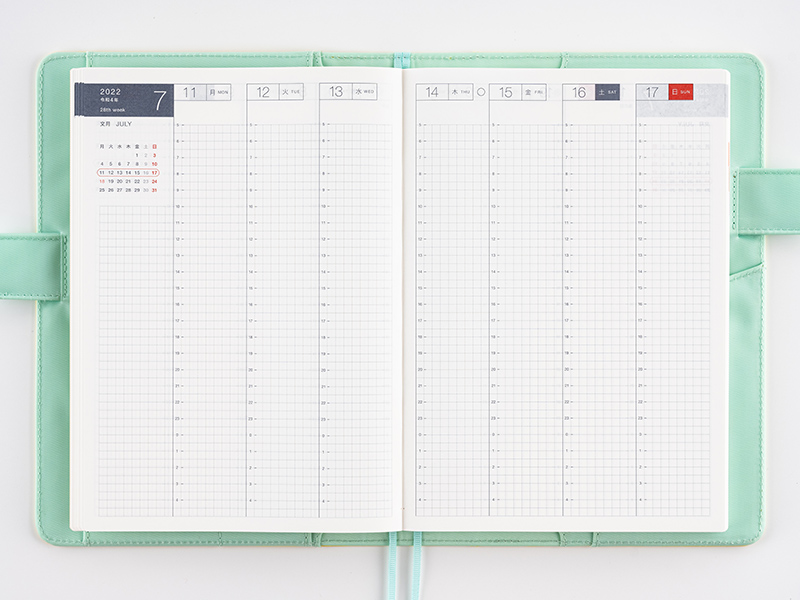 カズンには、見開きで週の予定管理をできる「週間ダイアリー」がついています。「5時から翌4時まで」のすべての時間の予定を記入することができます。