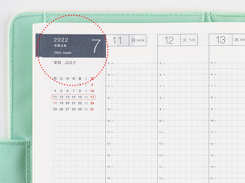 ページの左側にはその月のカレンダーを掲載しています。楕円で囲まれている1週間はそのときに開いているページを示しています。その下には、週全体のことを記入できるフリースペースを設けています。