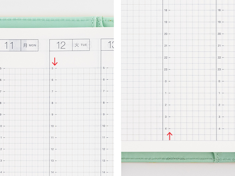 朝5時から翌朝4時までの時間軸で、24時間の予定を掲載しています。1時間に2マス分のスペースがあるため、スケジュールを30分刻みで書き込めます。