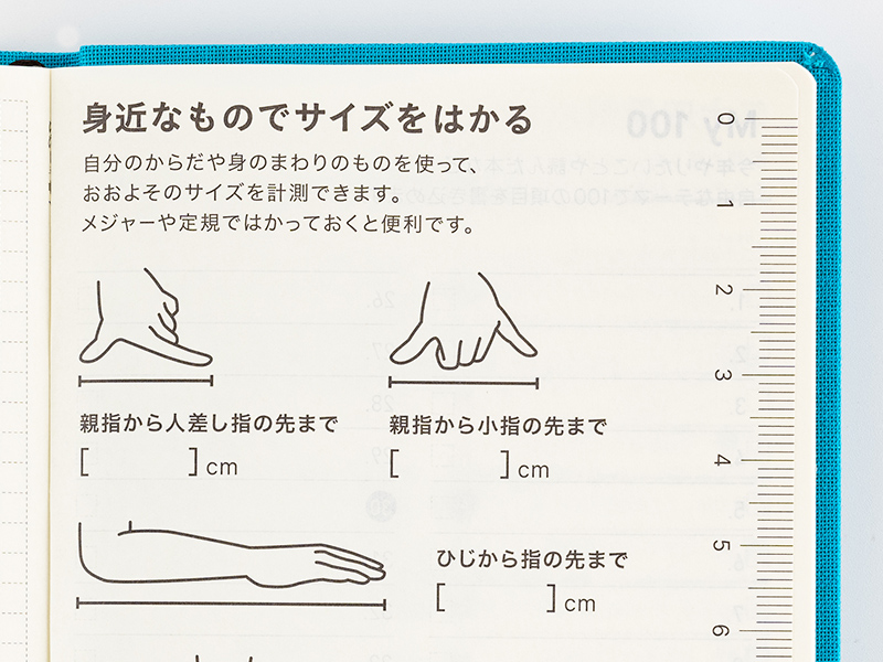 外出先などで、ちょっとしたサイズをはかりたいときに役立つページです。端には18cm定規をプリントしています。