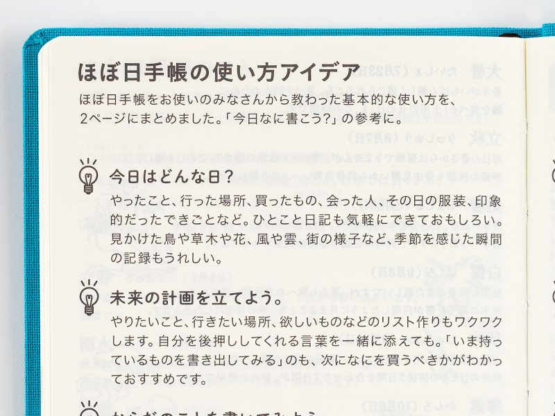 ほぼ日手帳をお使いのみなさんから教わった基本的な使い方をまとめました。「今日なに書こう?」の参考にすることができます。