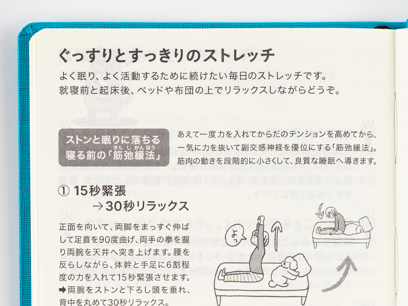 中野ジェームス修一さん監修の毎日のストレッチを、あらいのりこさんのかわいいイラストでご紹介。よく眠り、よく活動するために、就寝前と起床後にベッドや布団の上でリラックスしながらどうぞ。