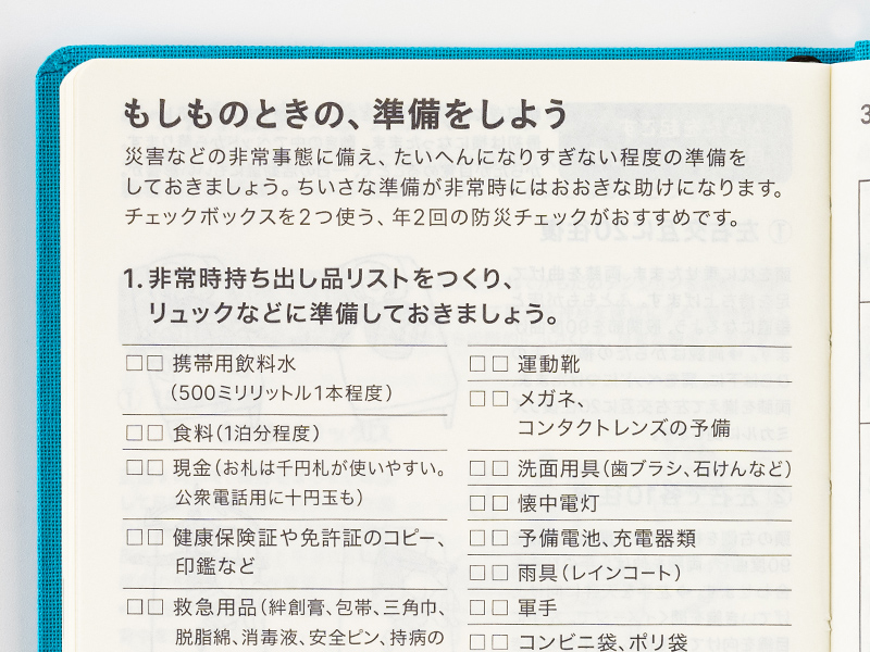 非常時の持ち出し品と、ふだんから備蓄しておきたいものをまとめました。避難場所や緊急連絡先など、家族や親しい人と話し合ったことを書いておけるスペースもあります。
