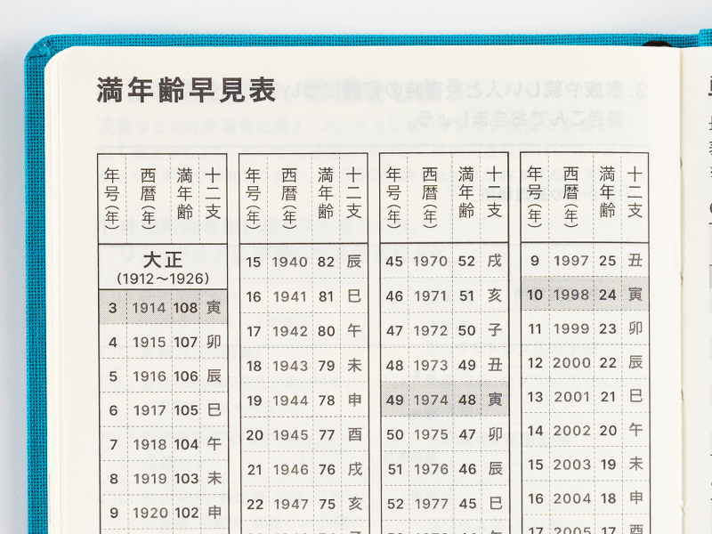 満年齢と十二支が、ひと目でわかる早見表。満年齢0歳から108歳まで掲載しています。2022年の干支である「寅」の行には背景に色を入れ、年男と年女がすぐわかるようにしました。