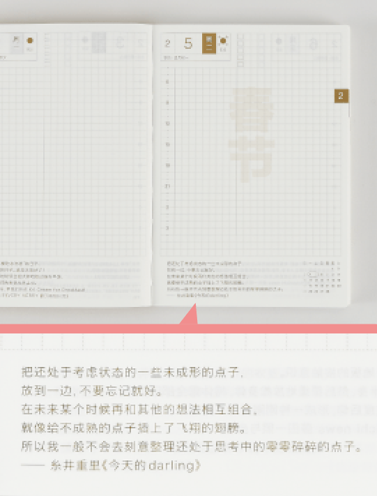 3年目、多くのかたからの「革の手帳がほしいです」という声を受けて、黒革・茶革・ヌメ革のカバーが登場。5色のナイロンカバーとあわせて8種類から選べるようになりました。カバー自体も引き続き進化し、「外側のポケット」が登場。ナイロンカバーに撥水加工をほどこしたのも、この年からでした。手帳の中身は1日ページに「秘密の縦ライン(使いたい人だけが使えるさりげない区切り線)」が登場。チェックボックスはイラストがなくなり、シンプルな見た目になりました。さらにこの年、それまで全ページに入っているわけではなかった「日々の言葉」が365日すべてに入るようになりました。「ほぼ日刊イトイ新聞」から生まれた手帳ならではの特徴として、以来毎年収録されています。