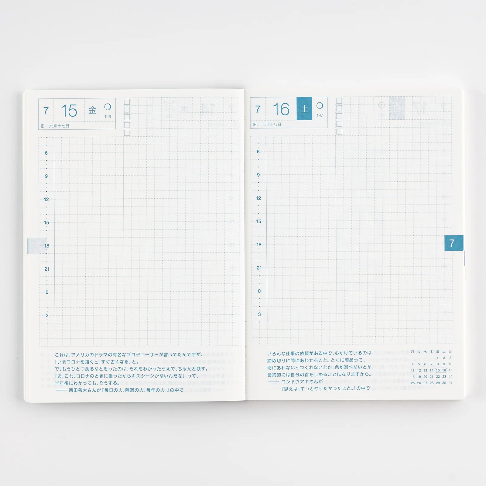 | 記載される内容 | 日番号/週番号(月間カレンダーに記載)/旧暦/六曜(大安、仏滅など)(月間カレンダーに記載)/二十四節気(立春、春分、夏至など)、雑節/祝日、記念日など(バレンタインデー、ひなまつり、母の日、父の日など)/月の満ち欠け(1日ページ全ページに記載、月間カレンダーに満月と新月のみ記載) |