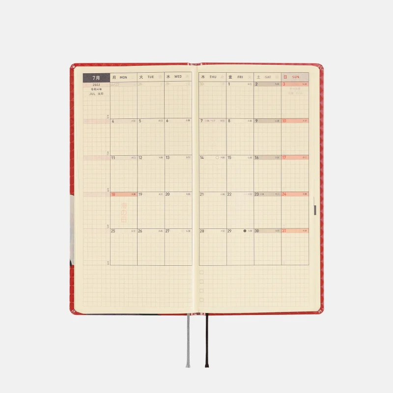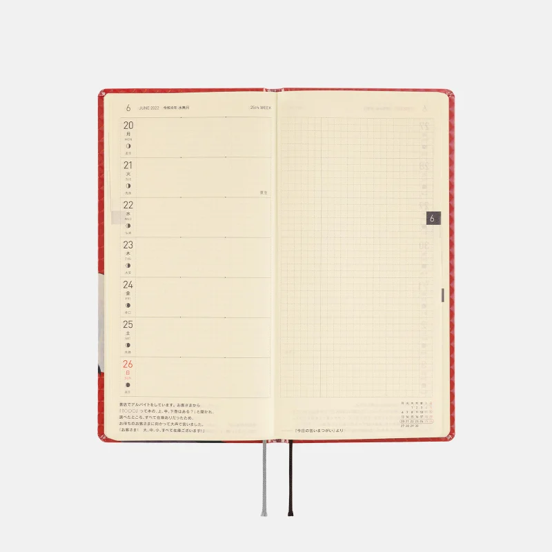 | 記載される内容 | 週番号/六曜(大安、仏滅など)/二十四節気(立春、春分、夏至など)/祝日、記念日など(バレンタインデー、ひなまつり、母の日、父の日など)/月の満ち欠け(週間ページ全てに記載・月間カレンダーに満月と新月のみ記載) |