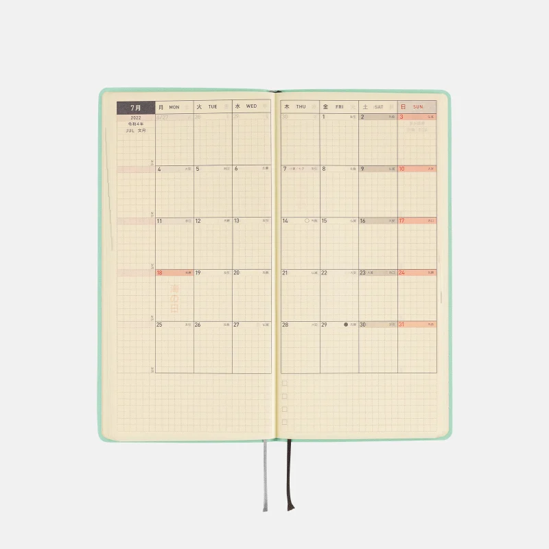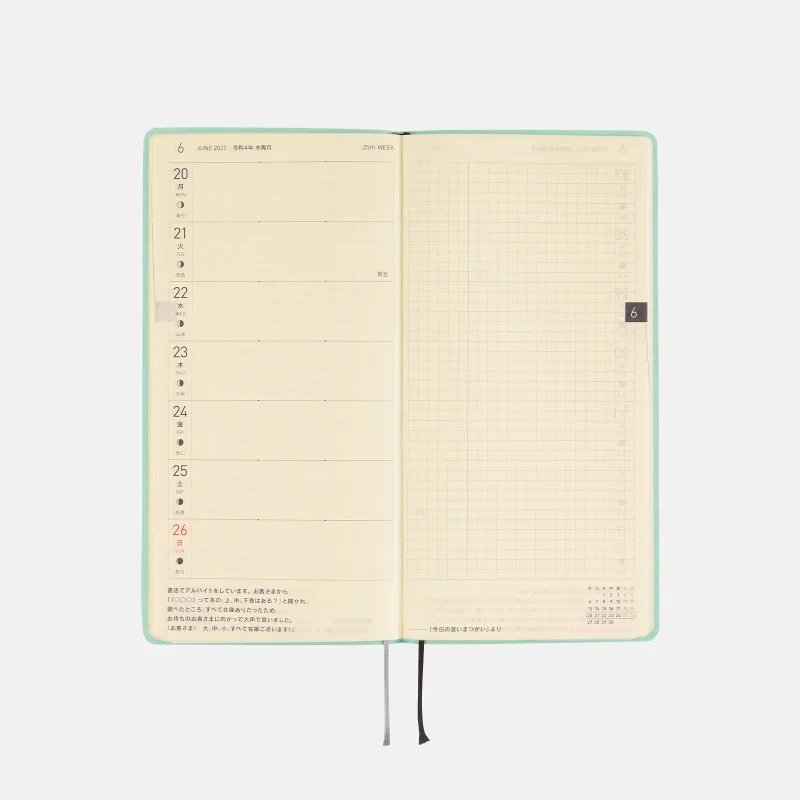 | 紙質・製本 | 薄くて軽く、裏抜けの少ないトモエリバー(手帳専用紙)/糸かがり製本 |