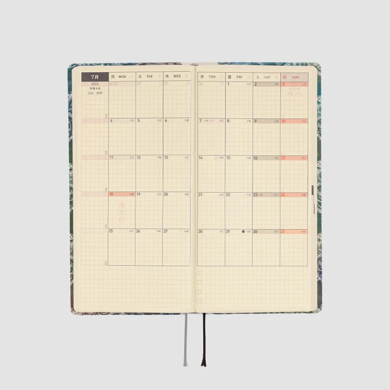 記載される内容 週番号/六曜(大安、仏滅など)/二十四節気(立春、春分、夏至など)/祝日、記念日など(バレンタインデー、ひなまつり、母の日、父の日など)/月の満ち欠け(週間ページ全てに記載・月間カレンダーに満月と新月のみ記載)