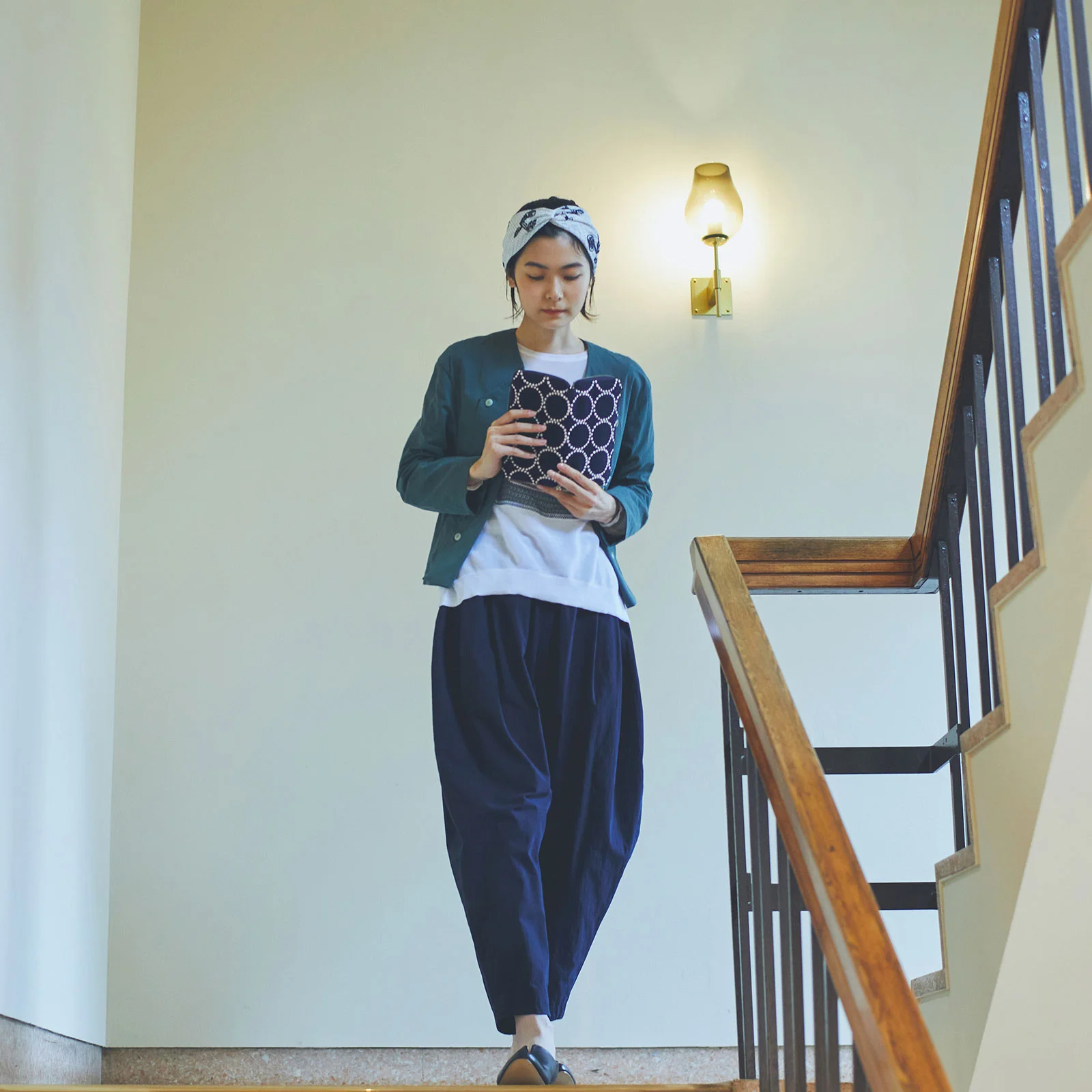sea fogジャケット ¥66,000、sea windowニット ¥55,000、sea fogパンツ ¥38,500、minä perhonen×hitomi shinoyama designヘッドアクセサリー ¥18,700、