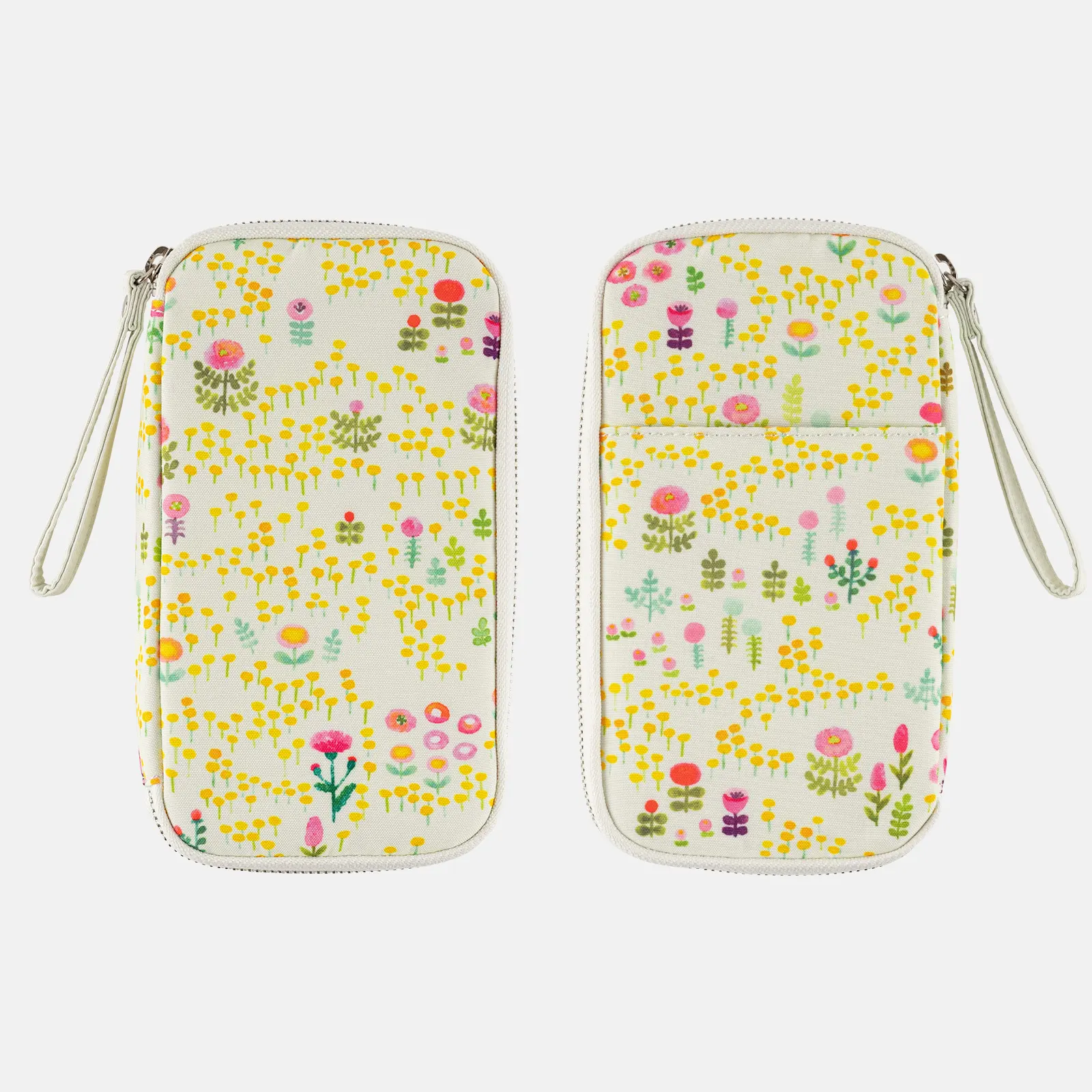黄色や赤の花々が水彩で描かれた柄は、