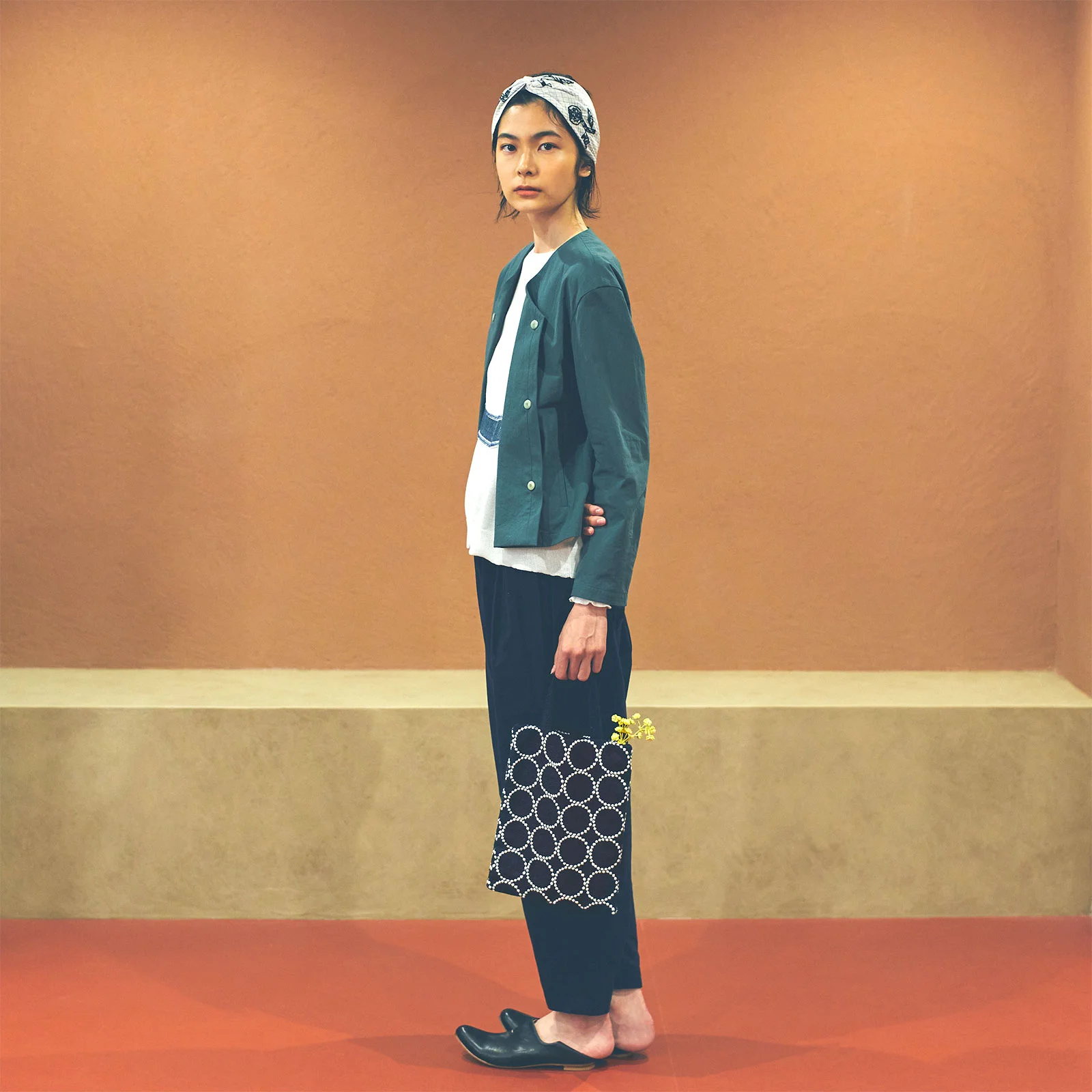 sea fogジャケット ¥66,000、sea windowニット ¥55,000、sea fogパンツ ¥38,500、minä perhonen×hitomi shinoyama designヘッドアクセサリー ¥18,700、stigaシューズ ¥46,200、