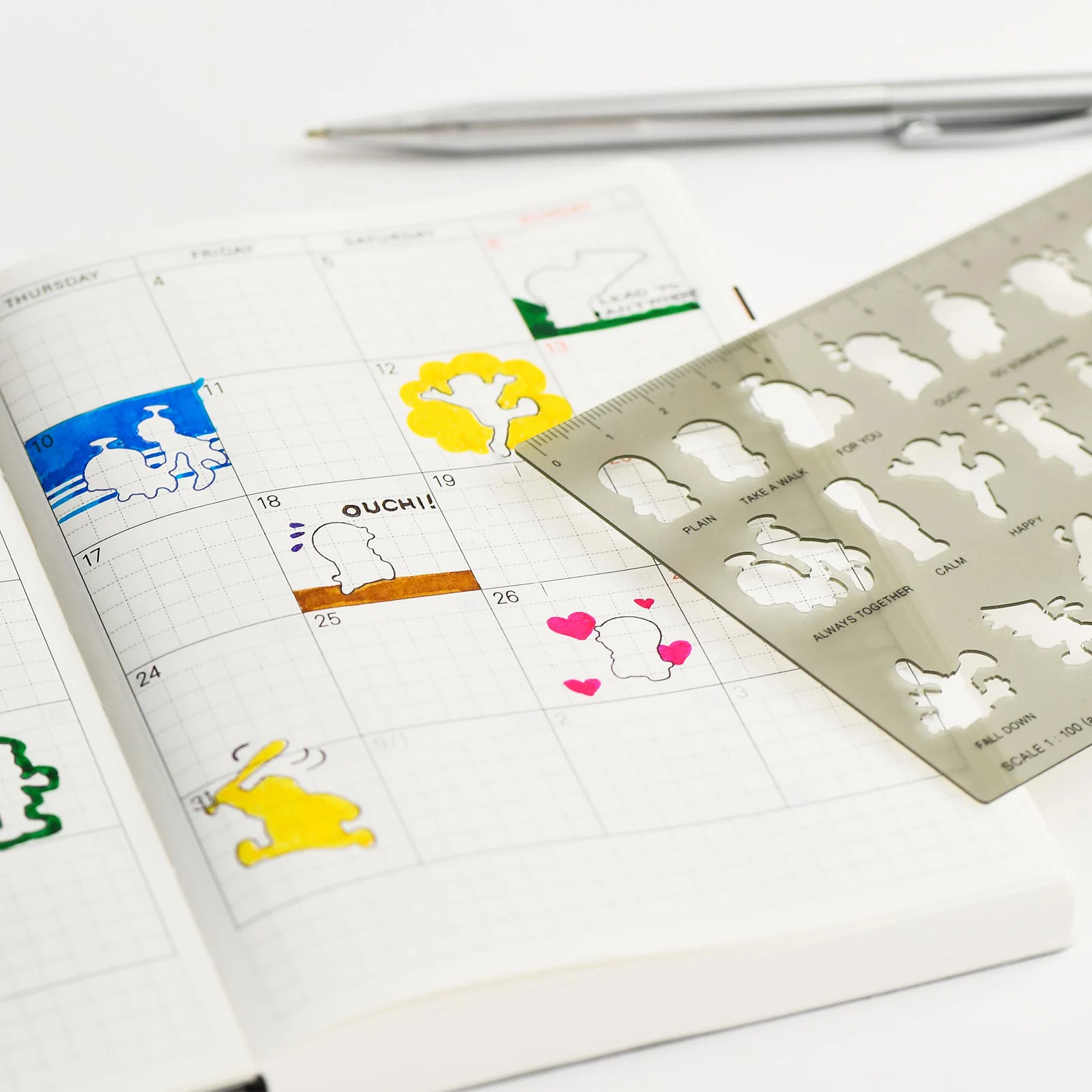 0.5ミリのシャープペンシルやほぼ日ストア特典のボールペン(三菱uniジェットストリーム0.5mm)用に設計されているため、ペン先の太いペンではうまく描けない場合があります。