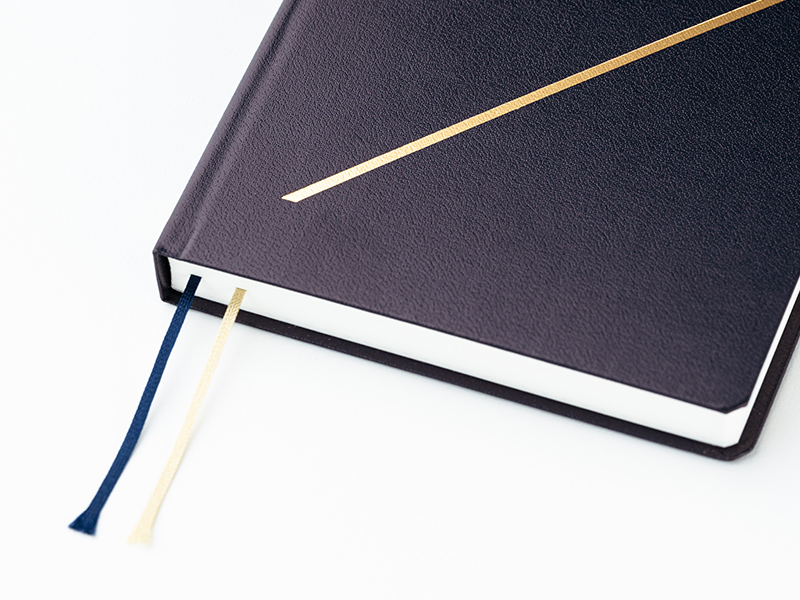 カバーをかけずに使えるかわりに、本体に2本のしおりをつけました。ネイビーとベージュの2本のしおりをよく開くページに1本ずつ挟んでおくと便利です。