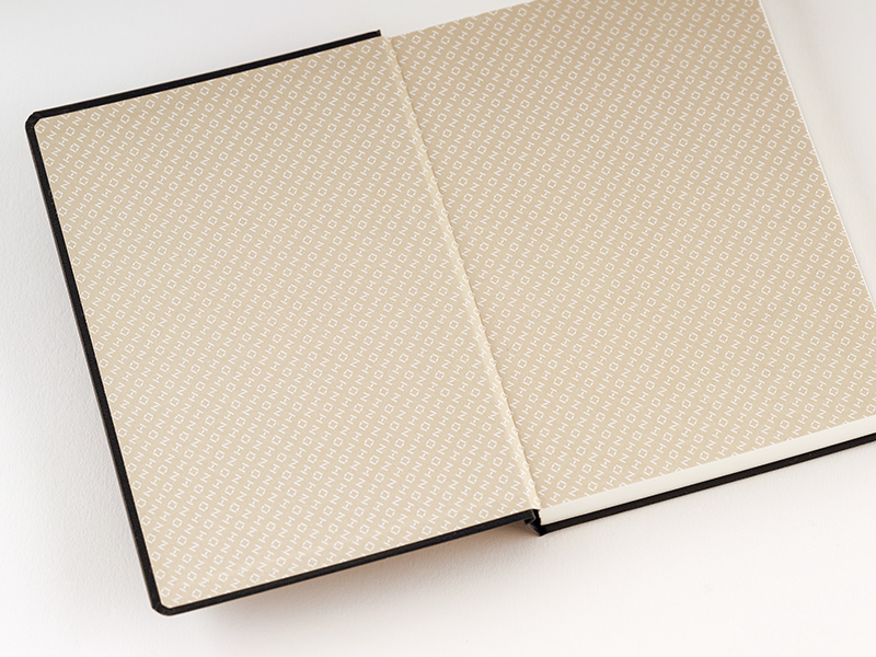 表紙を開いた見返しの部分は、「HON」だけのオリジナルデザイン。「HON」の文字を一面に散りばめたデザインパターンをプリントしました。