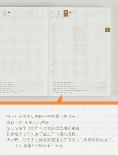3年目、多くのかたからの「革の手帳がほしいです」という声を受けて、黒革・茶革・ヌメ革のカバーが登場。5色のナイロンカバーとあわせて8種類から選べるようになりました。カバー自体も引き続き進化し、「外側のポケット」が登場。ナイロンカバーに撥水加工をほどこしたのも、この年からでした。手帳の中身は1日ページに「秘密の縦ライン(使いたい人だけが使えるさりげない区切り線)」が登場。チェックボックスはイラストがなくなり、シンプルな見た目になりました。さらにこの年、それまで全ページに入っているわけではなかった「日々の言葉」が365日すべてに入るようになりました。「ほぼ日刊イトイ新聞」から生まれた手帳ならではの特徴として、以来毎年収録されています。