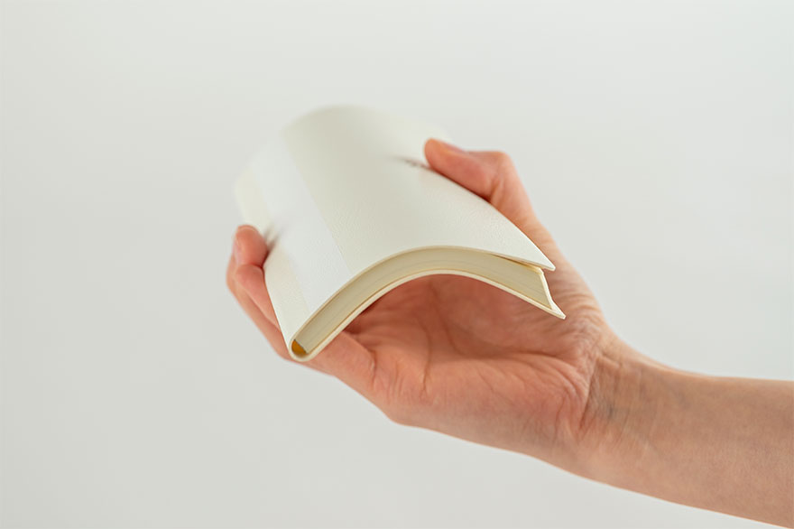 表紙素材の特性上、180度開くためには、手で軽くおさえる必要があります。